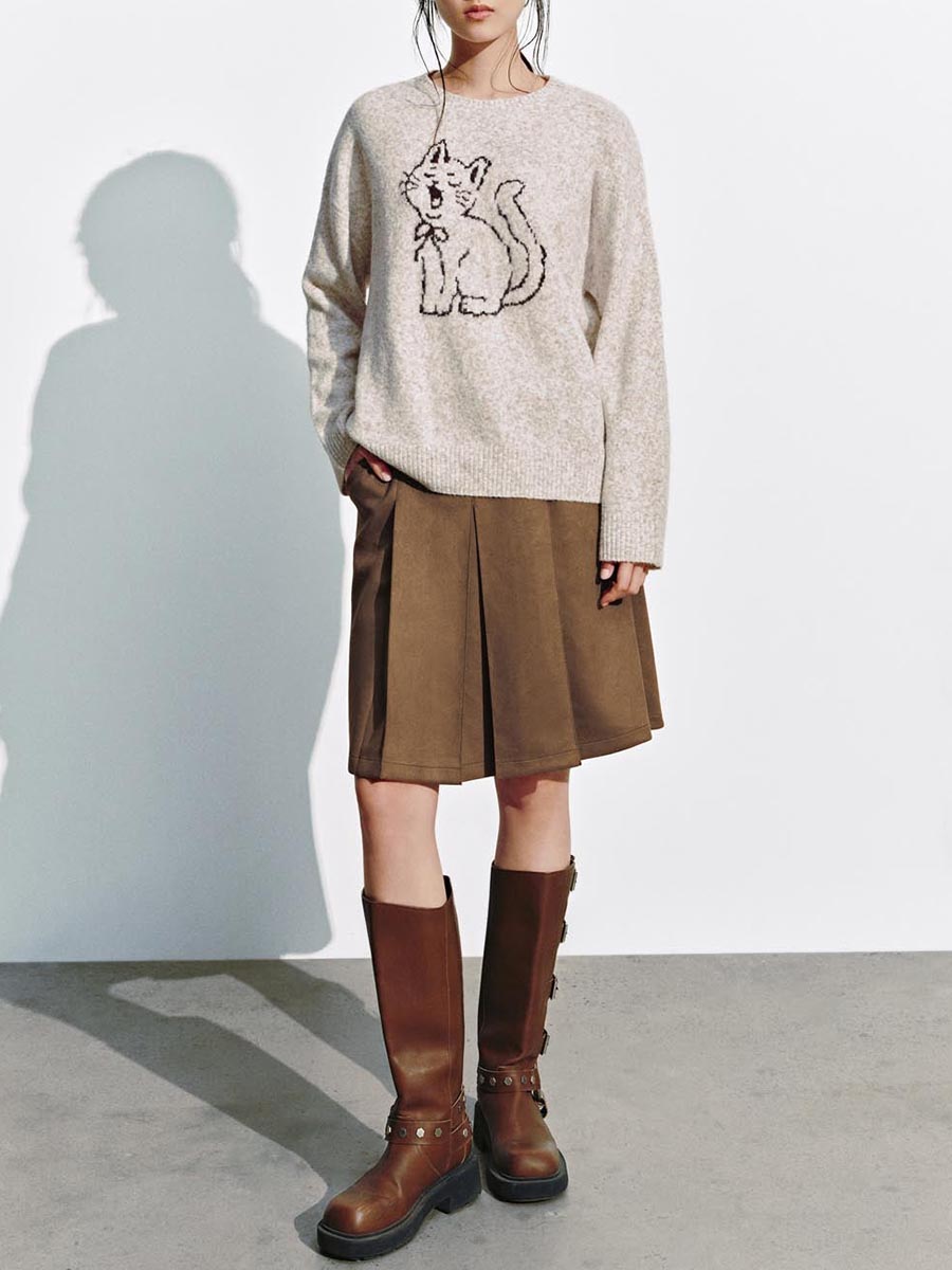 Lady's Cartoon Cat Embroidered Round-Neck Sweater 53913440